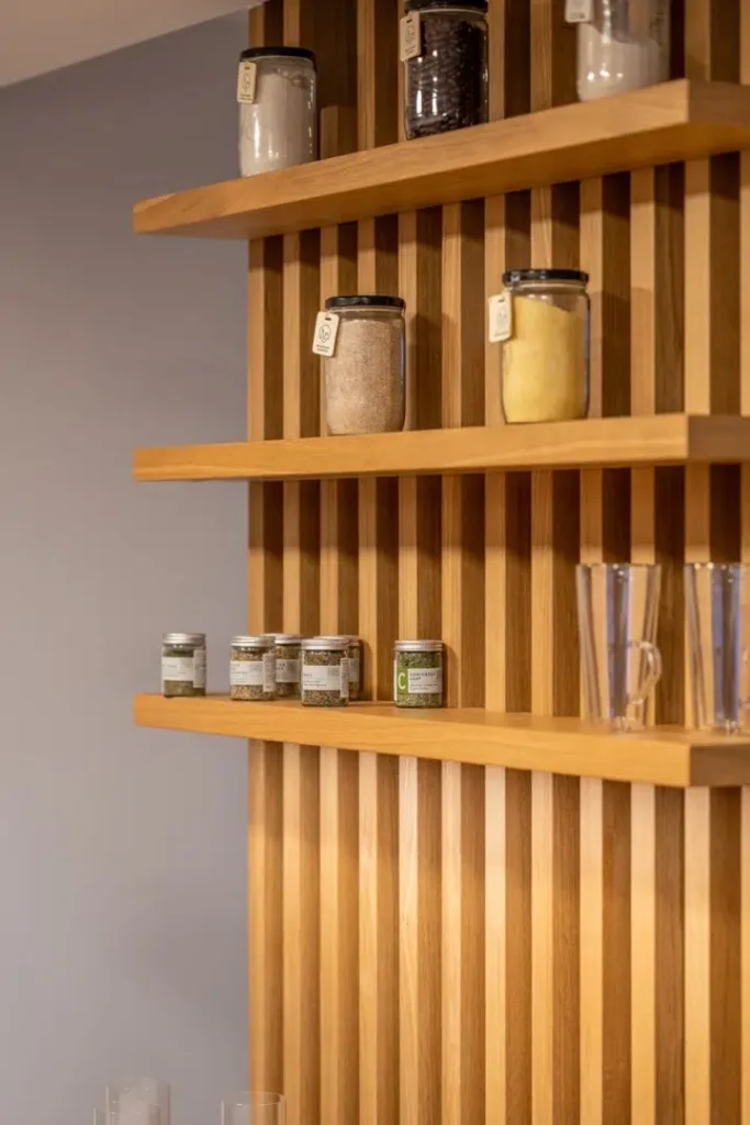 Přestože je byt koncipován především se záměrem nadčasového interiéru, tak bylo domyšleno i mnoho dalších prvků. Příkladem je třeba umístěná pračka se sušičkou do vestavné skříně, která je vybavena ventilátorem pro odtah přebytečného tepla či vlhkosti. Dálší výhodou je šatna částečně sloužící i jako komora, která je vybavena policovým systémem.