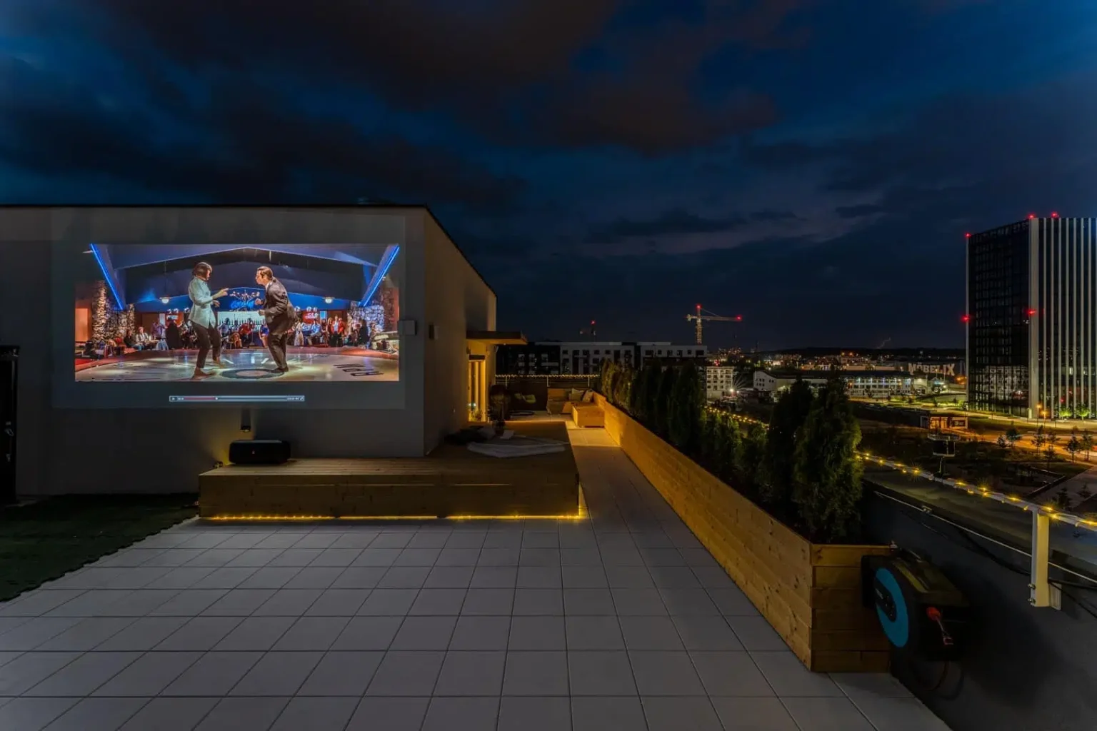 Vaše soukromé kino vám dovolí uspořádat naprosto jedinečné zážitky. Velikost terasy vám umožní pozvat opravdu početné publikum. Sledování sportovních utkání nebo filmu dostává v tomto bytě zcela jiný rozměr.