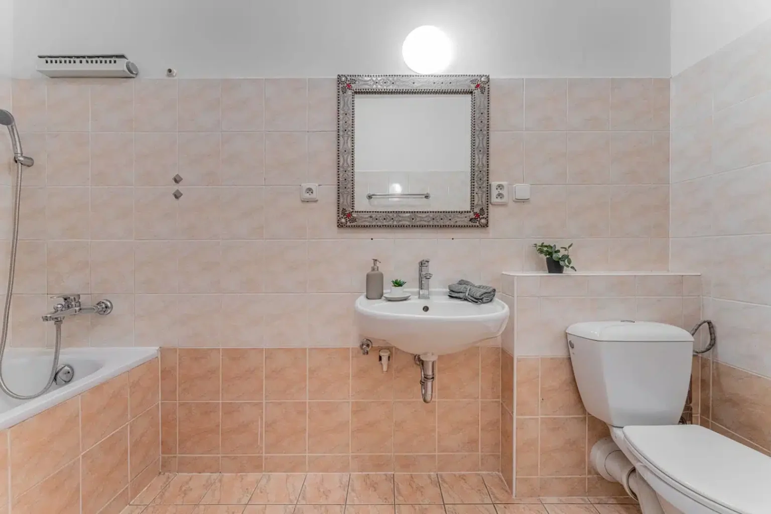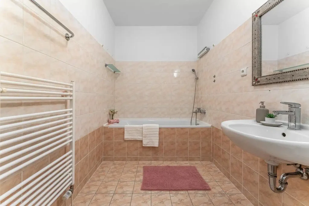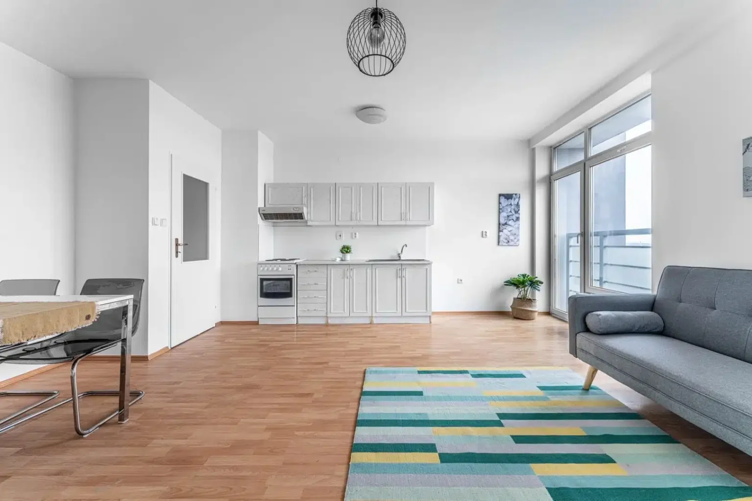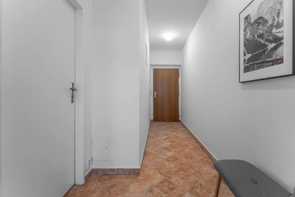 Vstupní chodba se před vstupem do hlavní místnosti rozšiřuje a umožňuje nejen vstup do koupelny, ale také vytvoření kabátové stěny pro odložení věcí. Byt si můžete kompletně celý pohodlně projít díky virtuální prohlídce.