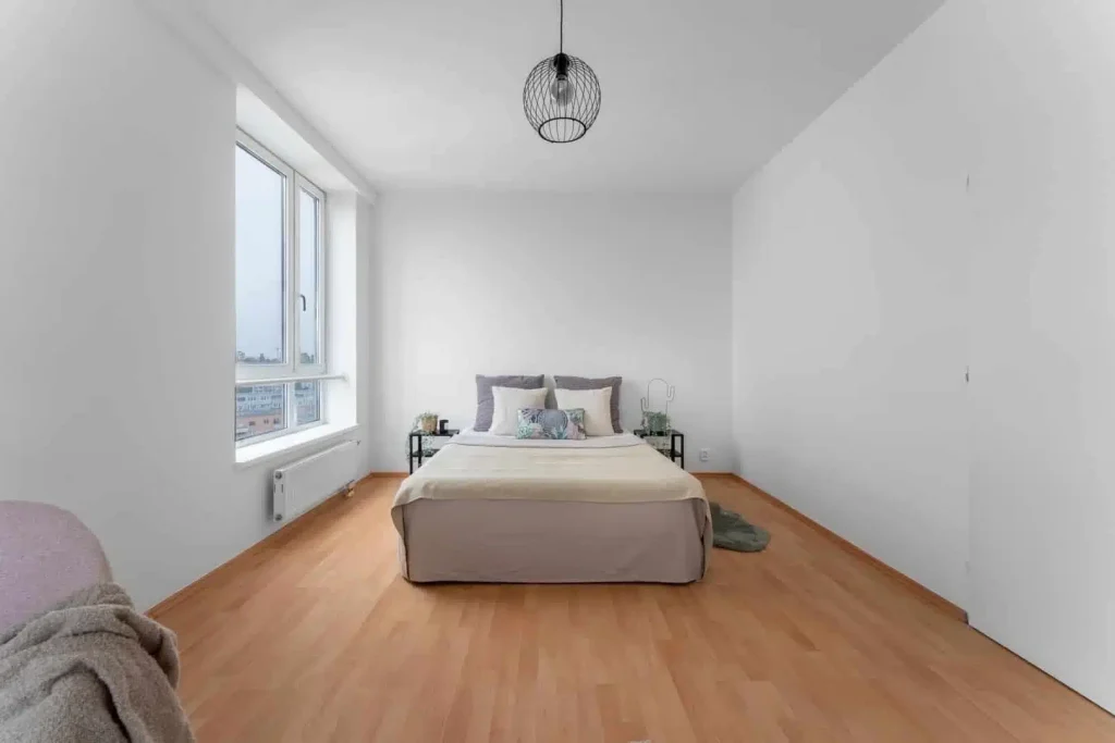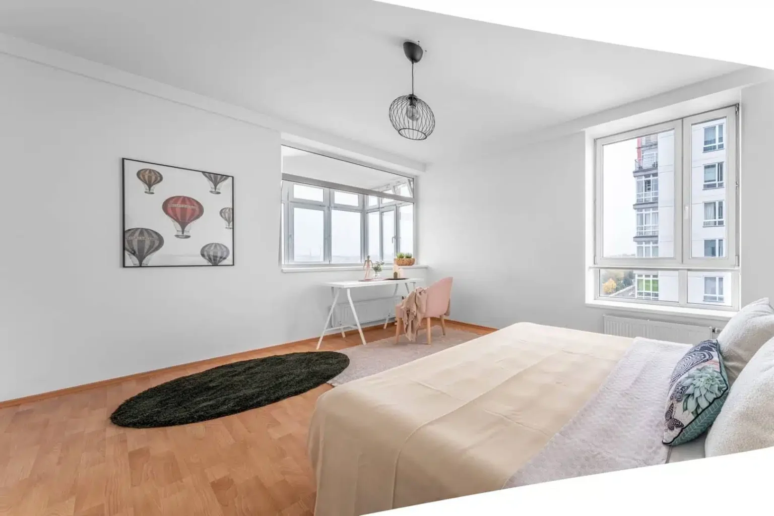 K hlavním přednostem bytu patří jeho prostornost. Ta je znát i v ložnici, o místo na líčící koutek, knihovnu nebo velkou šatní skříň se bát nemusíte. Zajímavostí je výhled na město ze zimní zahrady.