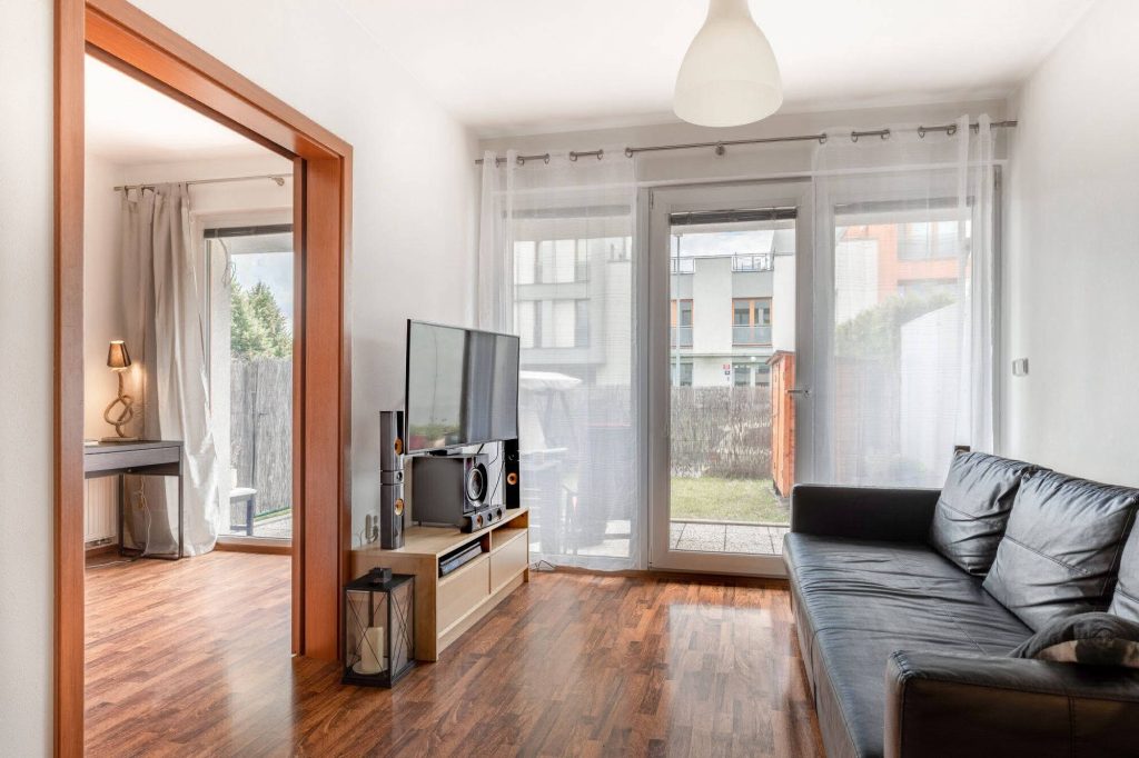 Na vstupní chodbu bytu s vestavnou skříní navazuje prostorná koupelna s toaletou. Vybavena je vanou, přípojkou pro pračku a otopným tělesem. V rohu světlého obývacího pokoje je umístěn moderní kuchyňský kout. Na předzahrádku je možné vstoupit jak z tohoto pokoje, tak z ložnice, která je od obývací části oddělena příčkou s posuvnými dveřmi. Francouzská okna jsou připravena na možnou instalaci elektrických venkovních rolet. K bytu je možné využívat společnou kočárkárnu.