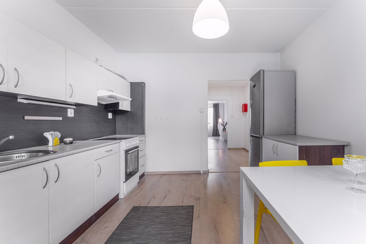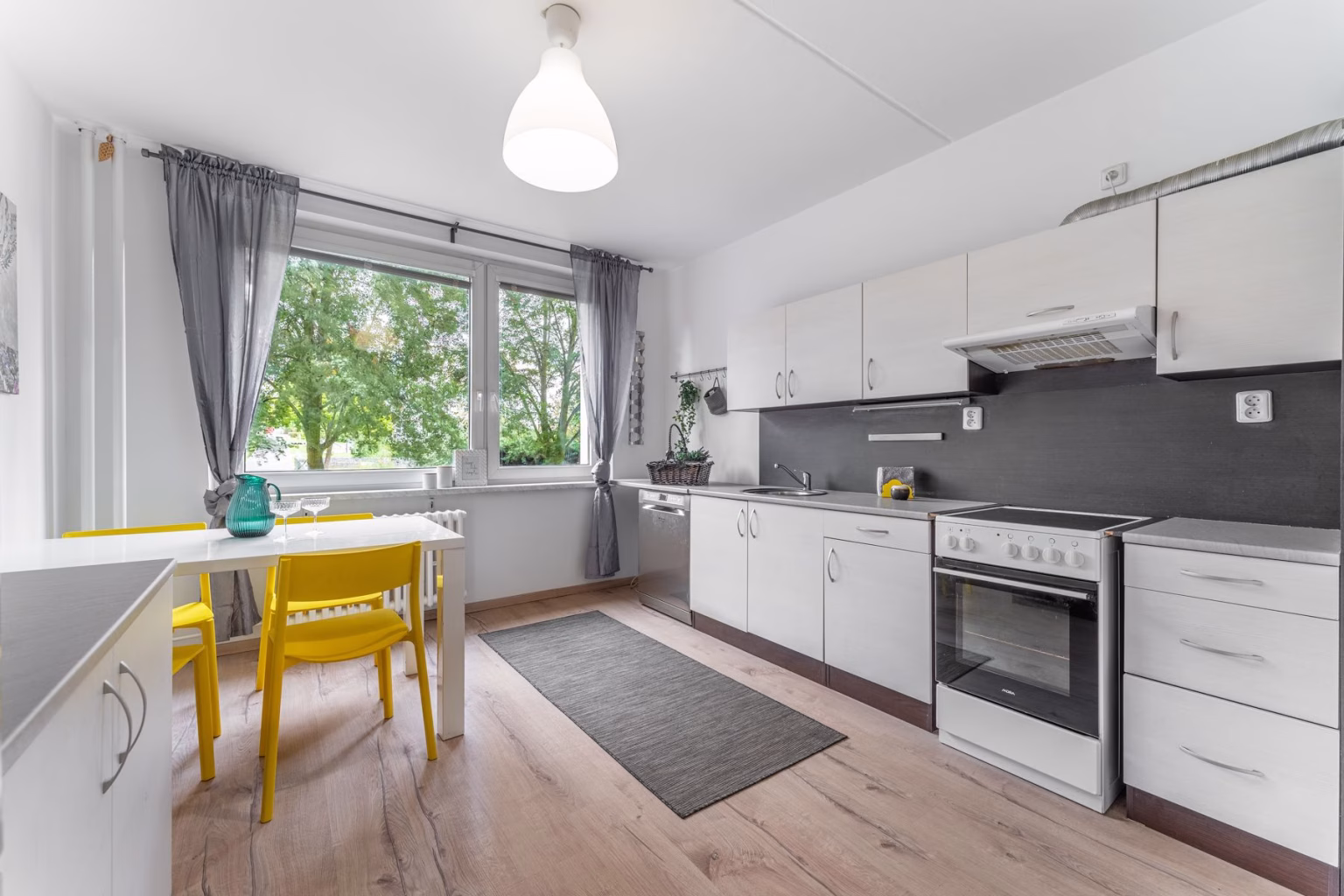 Prostorná kuchyně je vybavena sektorovou kuchyňskou linkou s volně stojícím sporákem s elektrickou varnou deskou, myčkou a lednicí. Díky velkosti kuchyně se pohodlně vejde i větší jídelní stůl pro 4 až 6 osob. Pokud se v budoucnu rozhodnete pro výměnu kuchyňské linky, díky pravidelnému tvaru pokoje a jeho velikosti si budete moci dopřát i modernější uspořádání kuchyně.