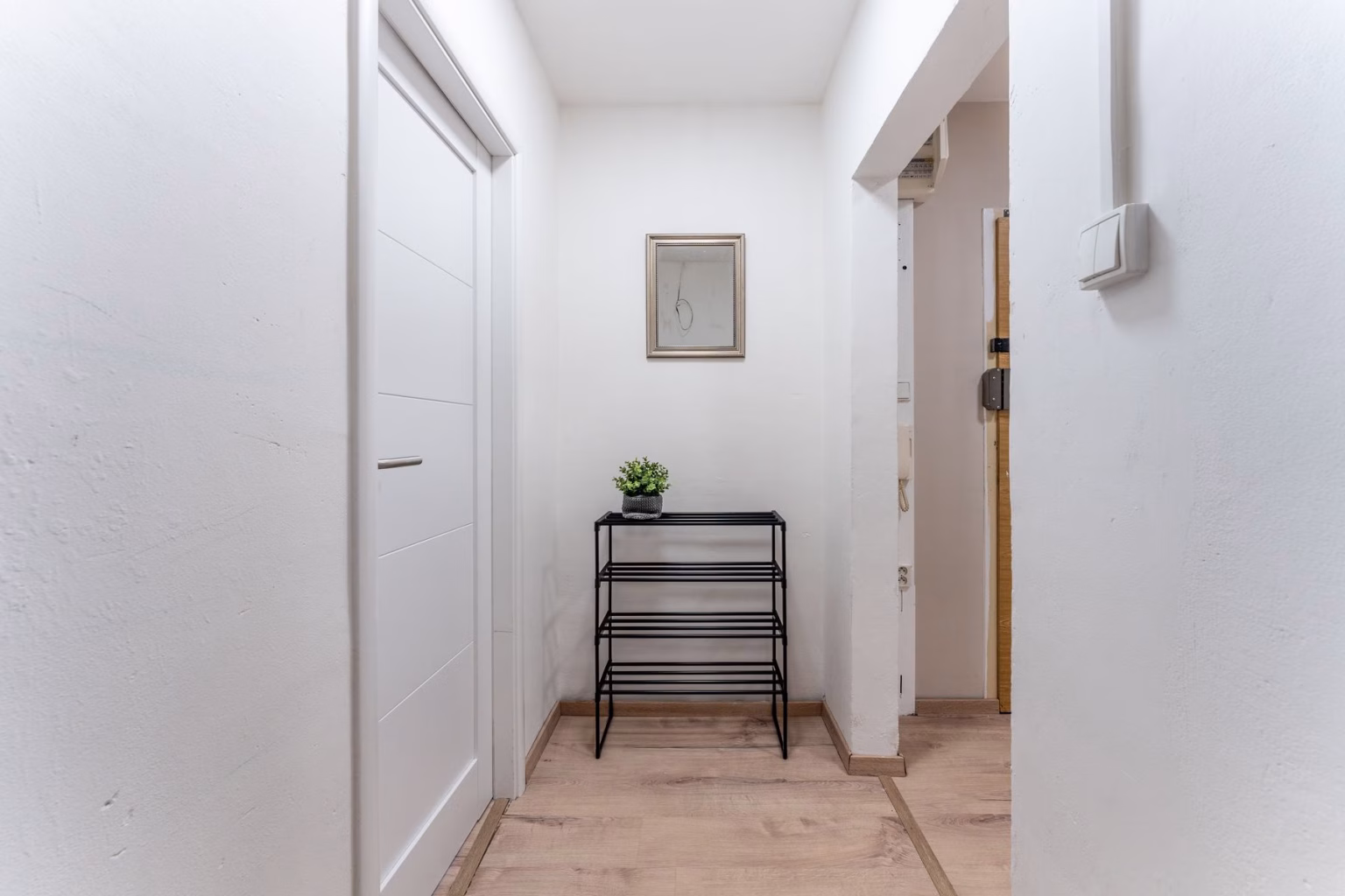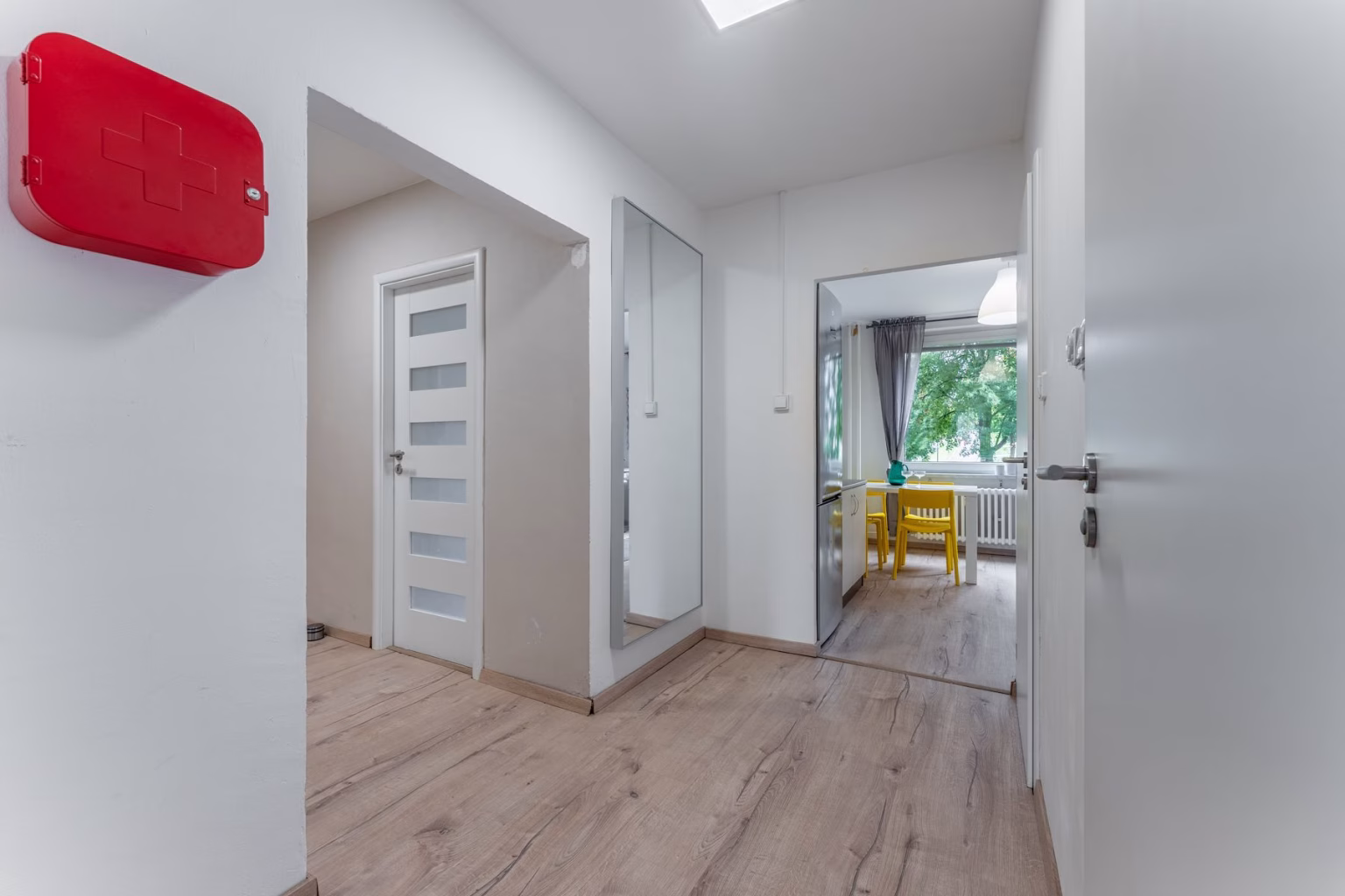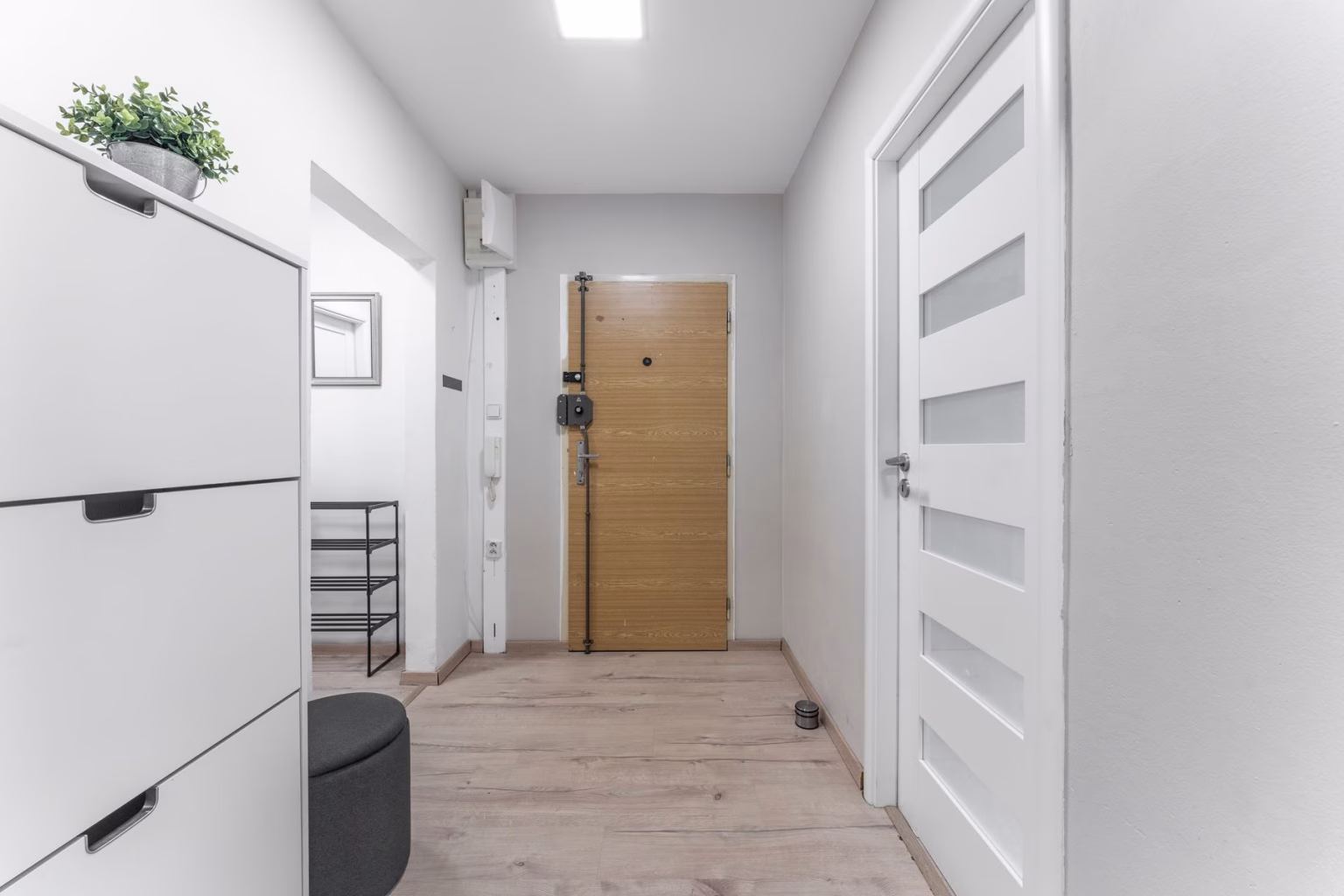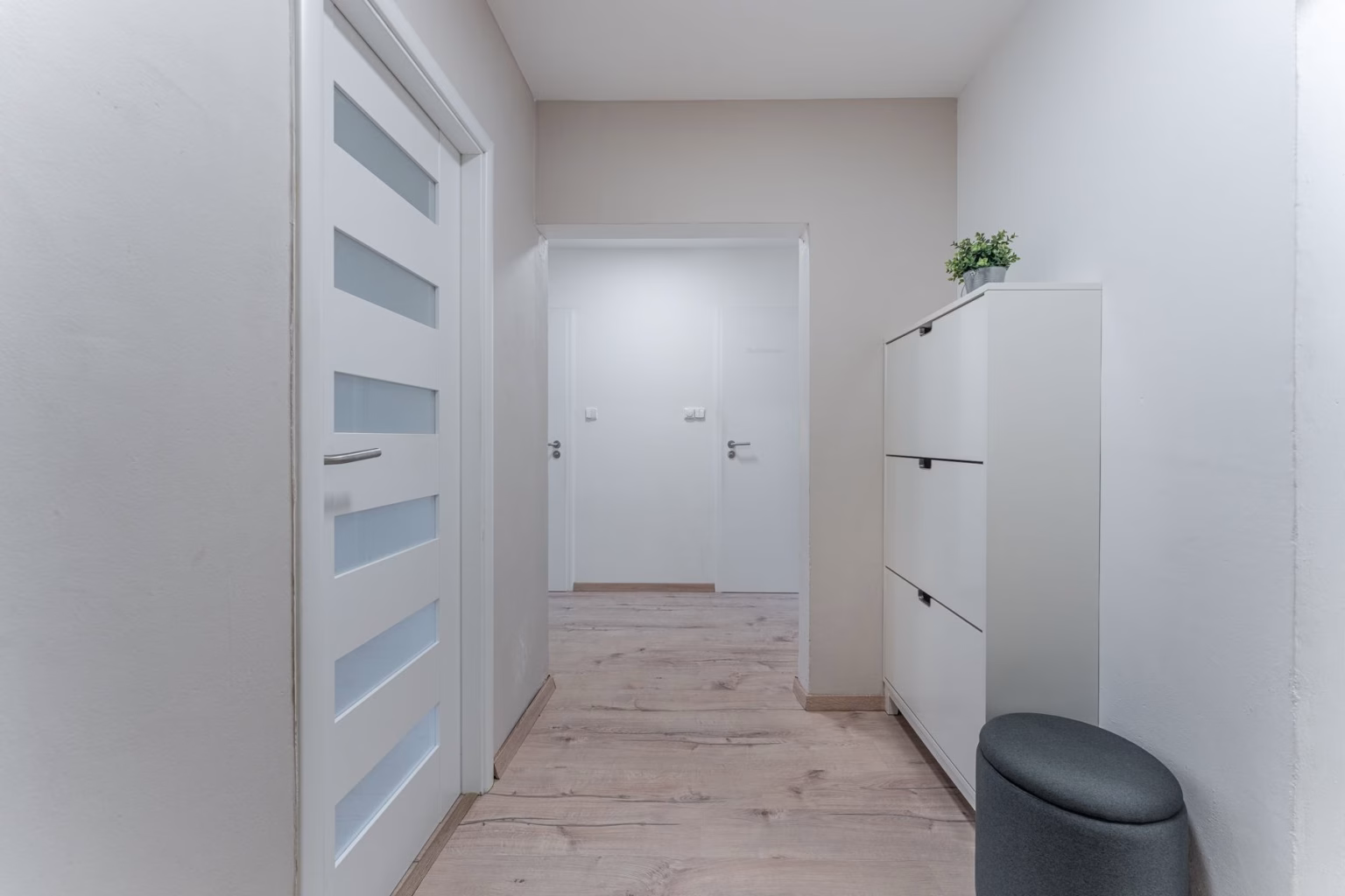 Vstupní chodba rozděluje jednotlivé neprůchozí pokoje. Původní dveře jsou opatřeny bezpečnostním zámkem a rozpěrou pro zajištění většího pocitu bezpečí. Chodba navazuje na širší prostor, kde pohodlně umístíte menší skříň či botník nebo sportovní vybavení.