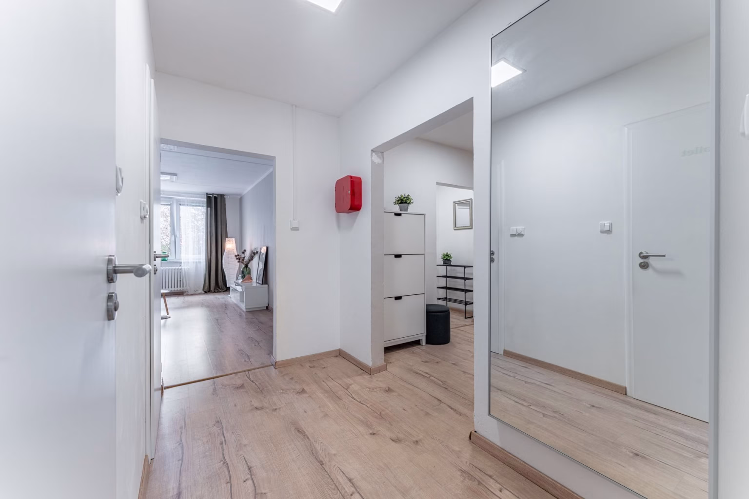 Vstupní chodba je dostatečně světlá, je vybavena velkým zrcadlem a drobnými prostory pro menší kusy nábytku. Všechny interiérové dveře byly vyměněny za nové. Celý interiér bytu je laděn do klidných, jemných barev s dostatkem světlosti, a to vše díky velkým oknům.