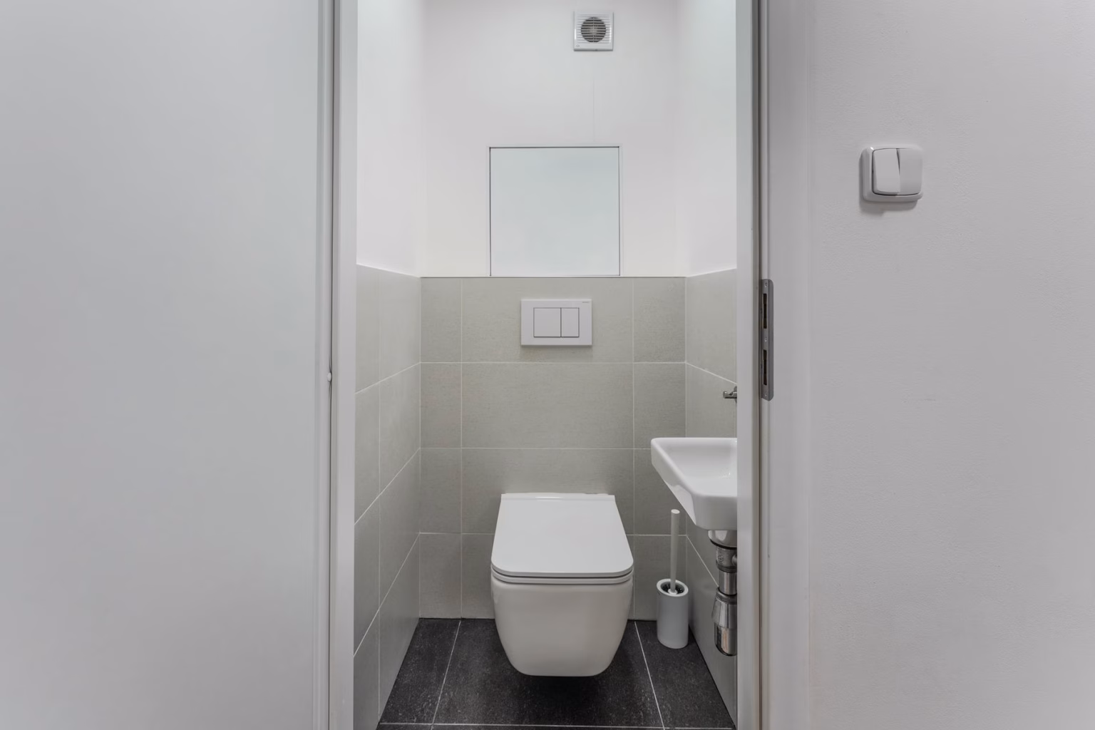 Koupelna s elektrickým podlahovým vytápěním je vybavena zděným sprchovým koutem s baterií GROHE a dešťovou sprchou, menším designovým umyvadlem a nástěnnou galerií. Vše v jednoduchých a nadčasových barvách. V koupelně je i sušička s pračkou, která může být případně součástí nabídky. Toaleta včetně menšího umyvadla je umístěna samostatně a je laděna do klidných barev.