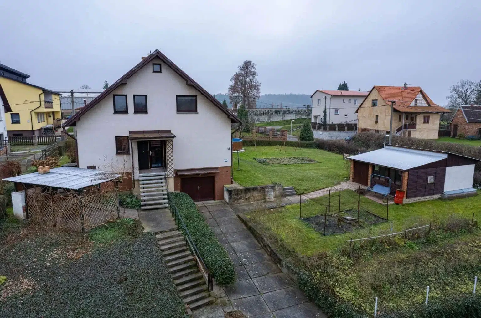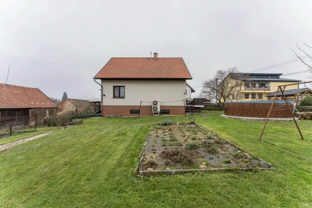 Příjezd k domu a na pozemek je po obecní asfaltce. Živý plot obklopuje pozemek, který je v jeho zadní části značně vyvýšený. K parkování můžete využít i betonové pásy přímo na pozemku. Vstup do domu je přímo přes garáž nebo schodiště.