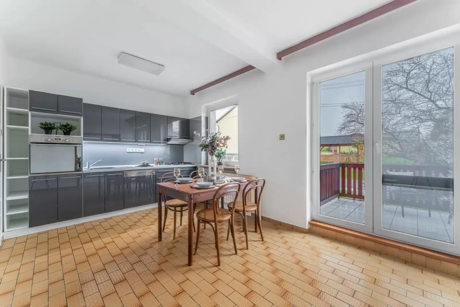 Současná dispozice je snadno upravitelná. Po pár úpravách lze vykouzlit až 42metrovou obytnou část s kuchyní se vstupem na 22metrovou terasu orientovanou do zahrady. Současné uspořádání nabízí komoru v kuchyni, velkou niku na lednici a přímé spojení z obývací části. Velké prosklení na terasu dopřává prostoru světlost.