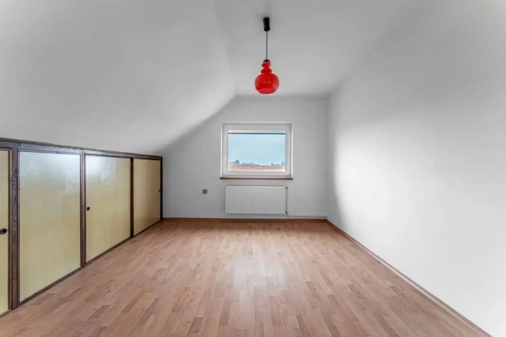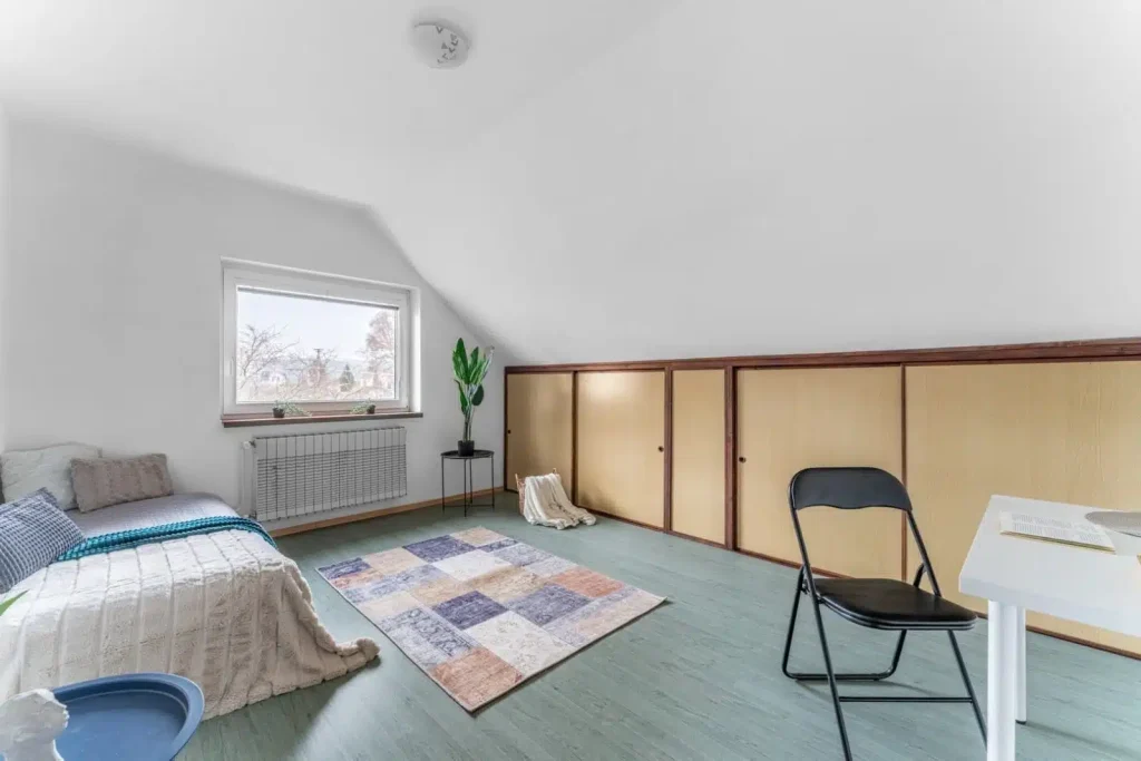 Obytné podkroví je s trojicí neprůchozích pokojů ideálním místem pro dětské pokoje. Úložné prostory jsou šikovně umístěné a pojmou velké množství věcí.