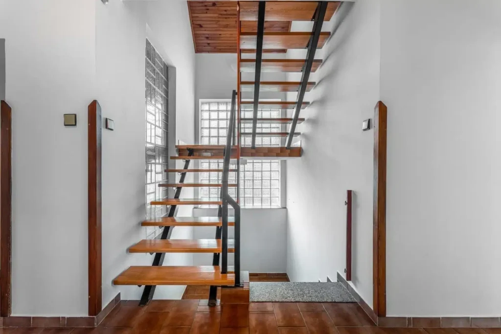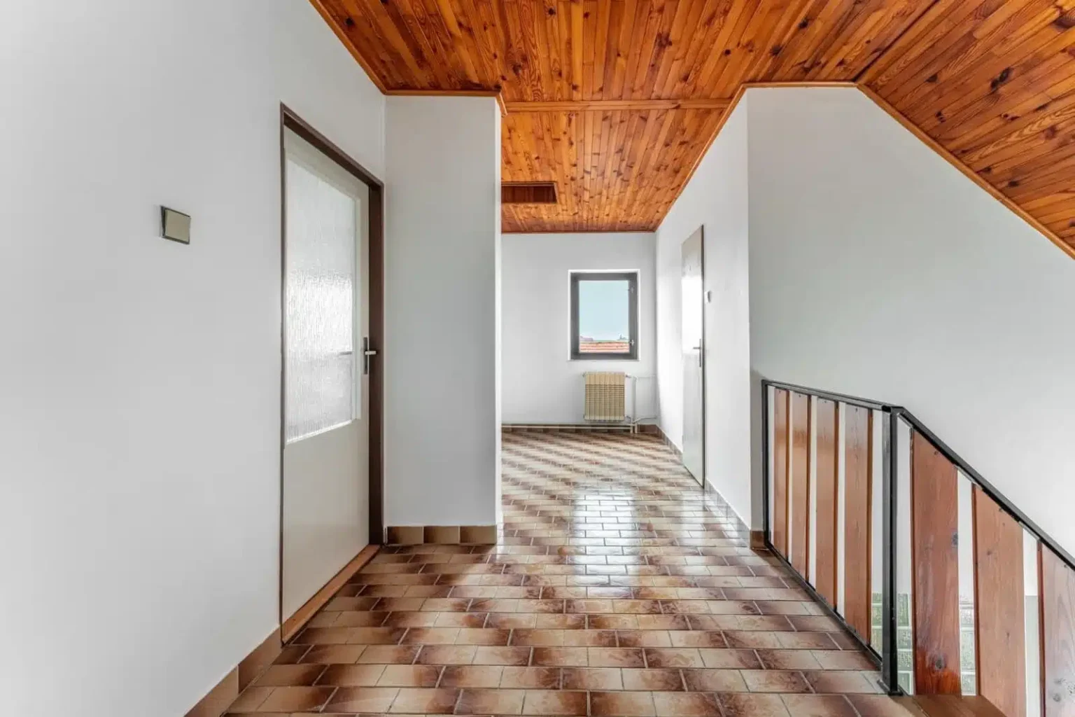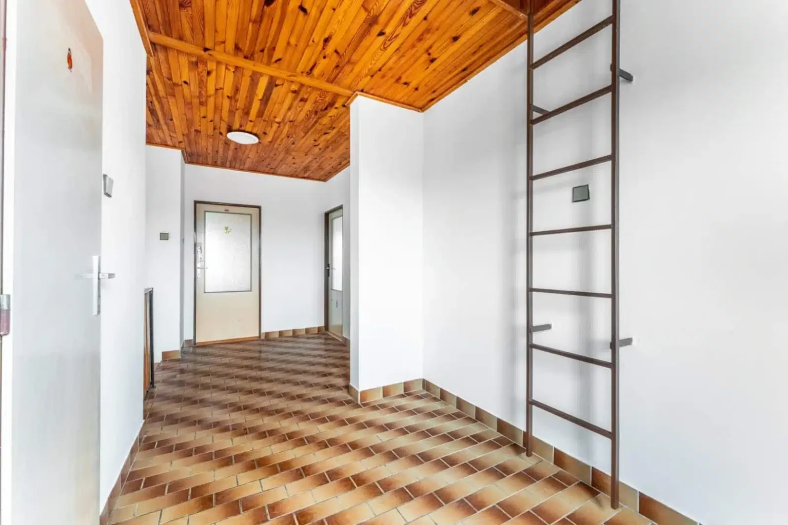 Vstup na pochozí půdu je po ocelovém schodišti a místa je v chodbě opět na rozdávání.