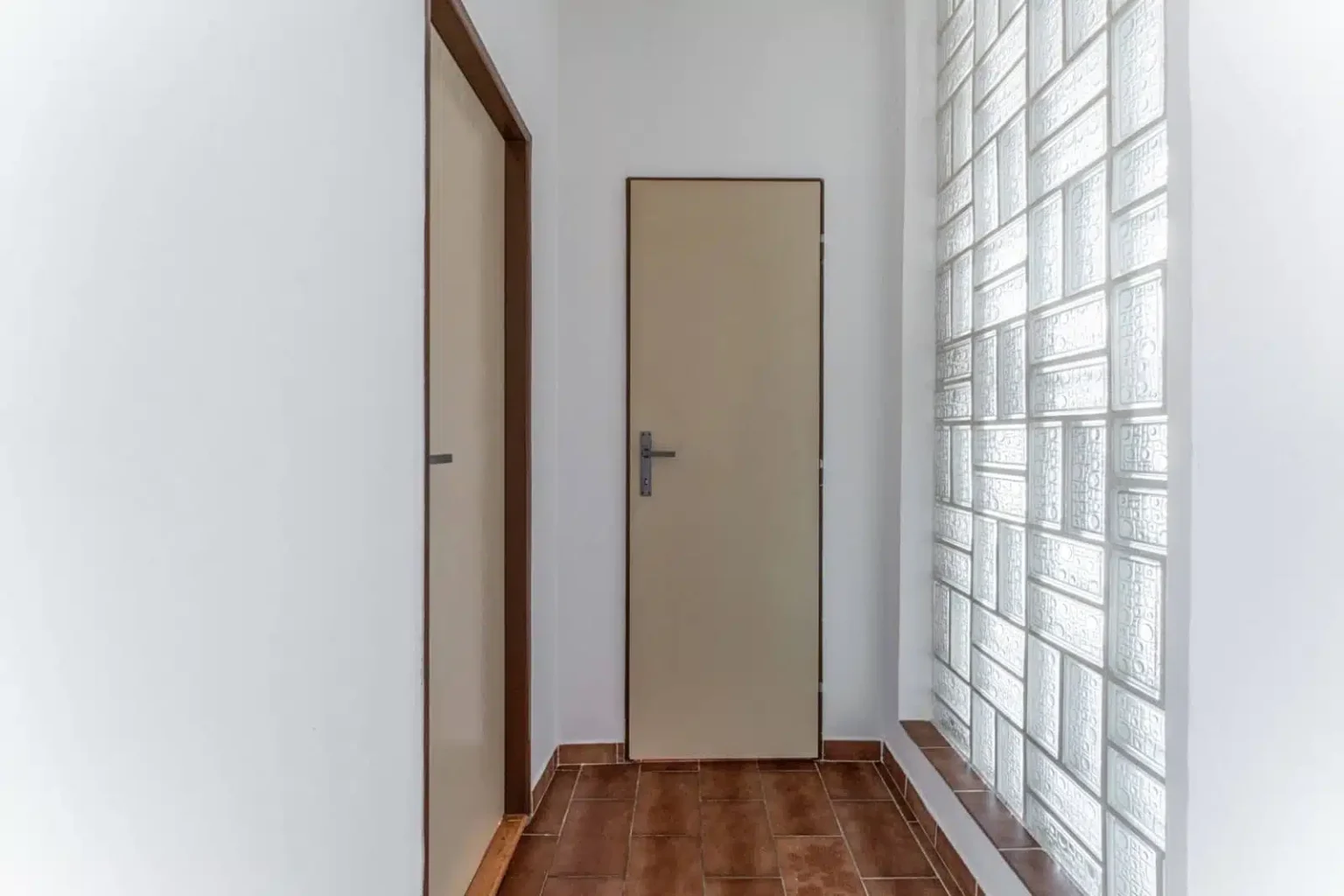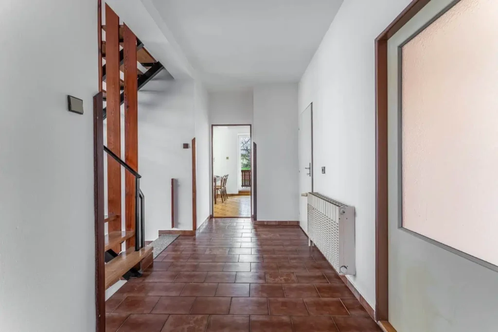 Vstup do domu je krytý. Jedná se o drobnost, ale v případě horšího počasí je to věc, kterou oceníte. Zádveří má dvojí uzavření a navazuje na prostornou světlou chodbu se schodištěm do podkroví.