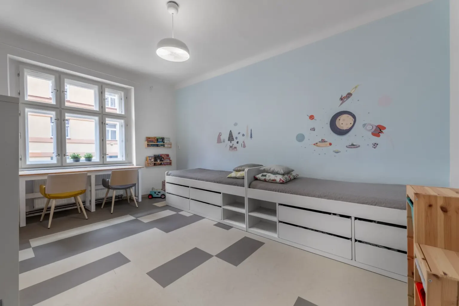 Samozřejmě nemůžeme zapomenout na to nejdůležitější, a to dětský pokoj. V současnosti je určen pro dva mladé výtržníky, kteří nejraději řádí ve vnitrobloku.