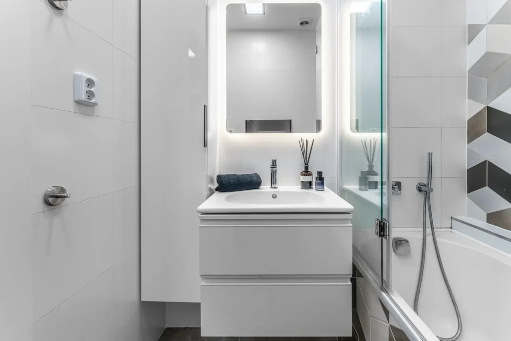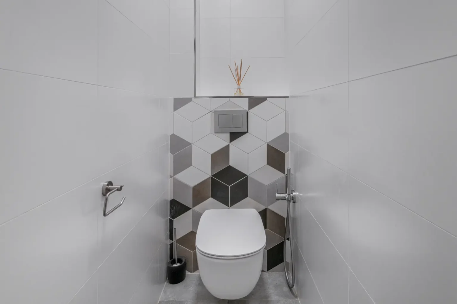 Trendy barevná kombinace a rozdílné formáty dlažby prostor opticky trochu zvětšují. Koupelna disponuje úložnými prostory a vanou se sprchovou zástěnou. Sluší se však přiznat, že taneční večírek bude lepší realizovat v obýváku. Příjemným benefitem je samostatná toaleta, která se nese v totožném dekoru.