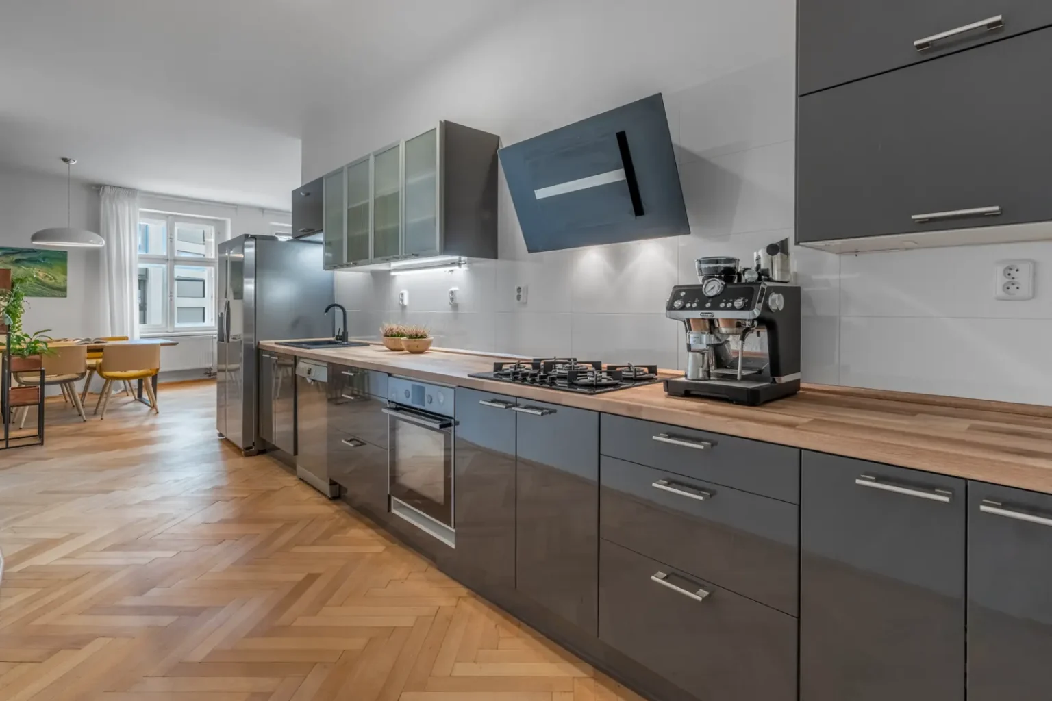 Praktická i stylová, prostě trendy kuchyně, tak jednoduše by se dalo popsat vaše nové zázemí pro spokojená bříška vaší rodiny. Milovníci vaření ocení dostatek pracovní plochy, vaření na plynu a úložné prostory, včetně moderních spotřebičů.