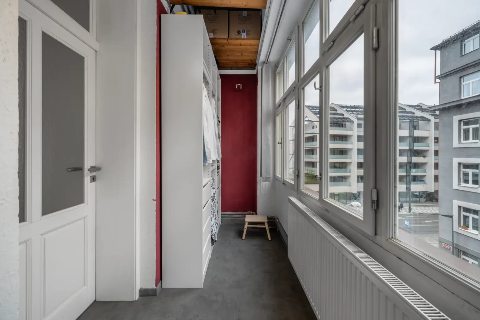 Chodba samozřejmě plní také svou zásadní funkci, a to přístup k příslušenství v podobě menší šatny, samostatné toalety, koupelny a dále na zasklenou lodžii. Byt disponuje bezpečnostními dveřmi.