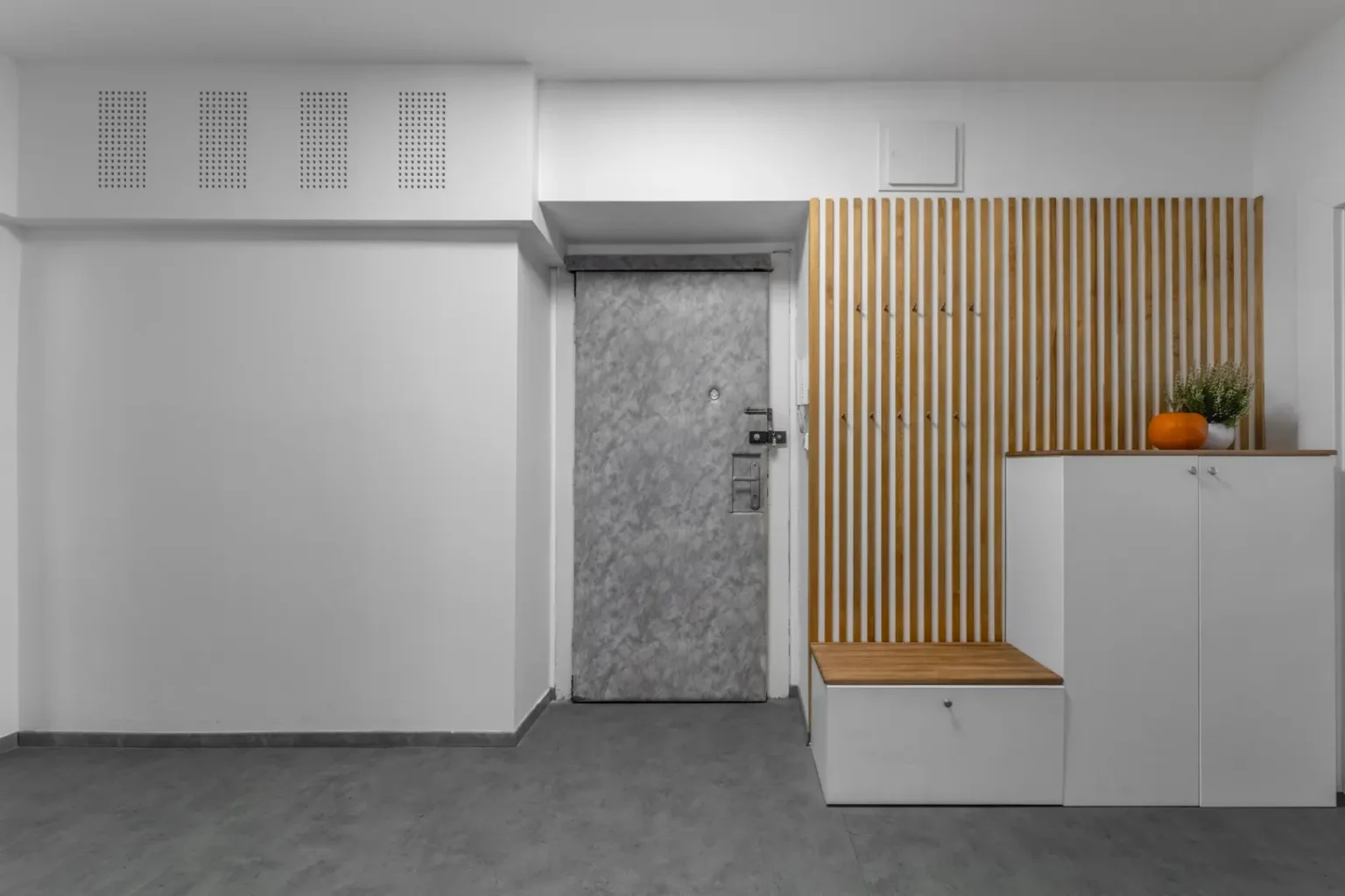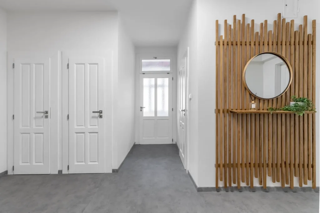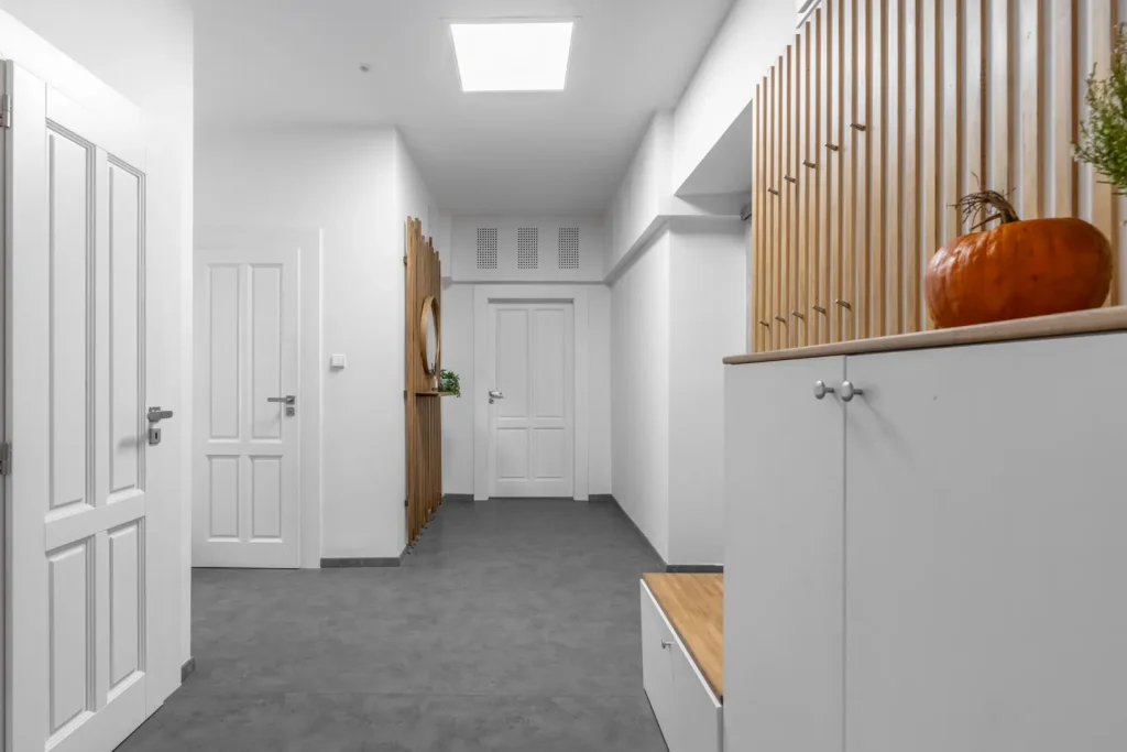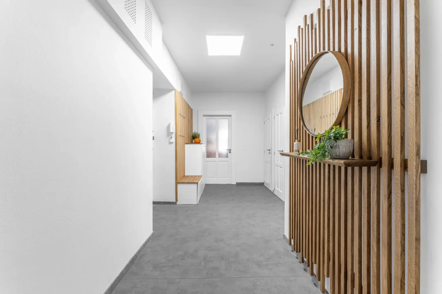 Hlavním koridorem této nemovitosti je vstupní chodba. Konečně bydlení, kdy při příchodu o sebe nebudete zakopávat a mačkat se. Dřevěné designové prvky potěší oko a vykouzlí hezké zázemí pro fotku na Instagram.