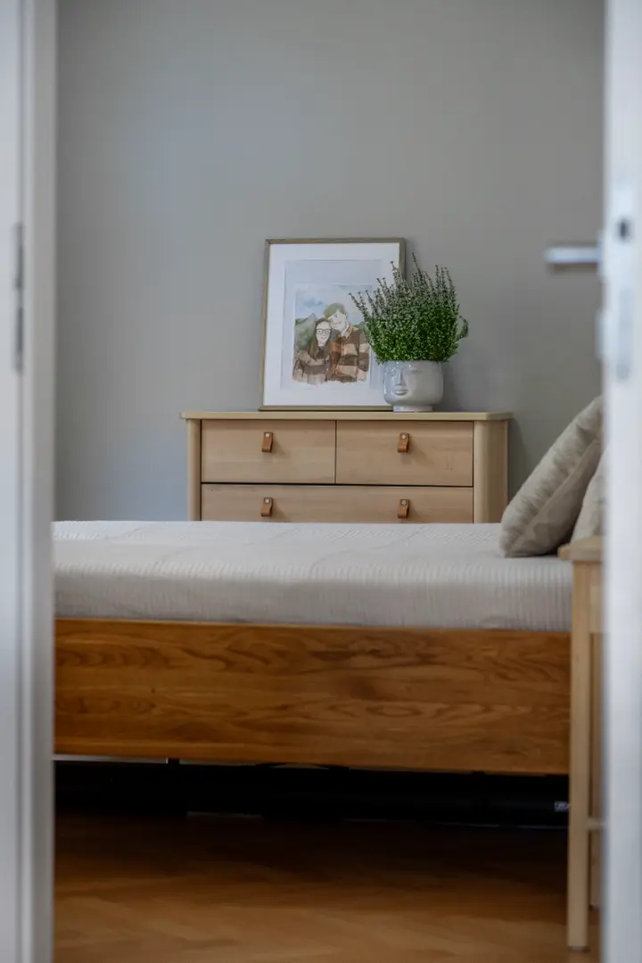 Jemná výmalba v ložnici působí klidným dojmem, ideální tvar místnosti dovoluje i umístění rozměrnější skříně či dětské postýlky. Trojité okno přináší dostatek světla.