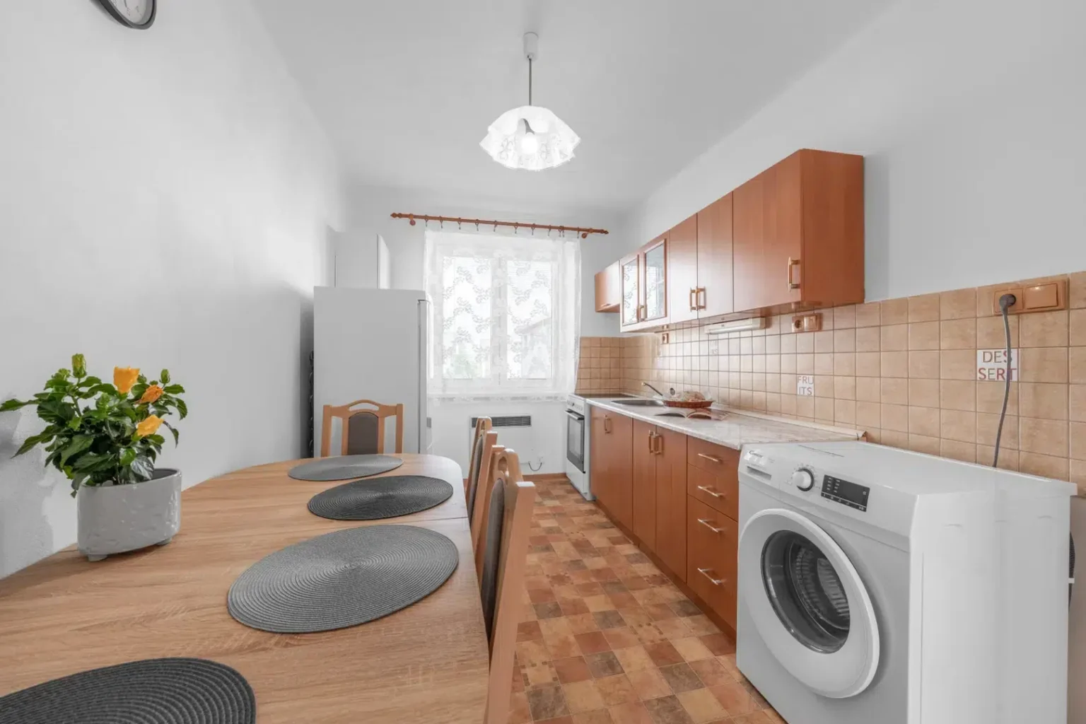 Standardní sektorová kuchyně, ačkoli skromně vybavená, plní svůj účel. Určitě oceníte především světlý prostor, snadný pohyb a dostatek místa pro větší stůl.