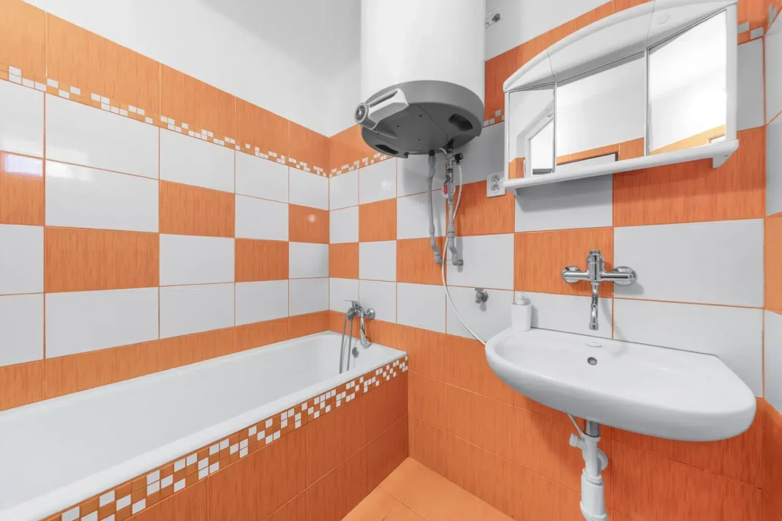 Koupelna byla v minulých letech zrekonstruována, je vybavena vanou, umyvadlem a možností připojení pračky, která je aktuálně umístěna v kuchyni. Ohřev vody je zajištěn elektrickým bojlerem a vytápění pomocí elektrických radiátorů.