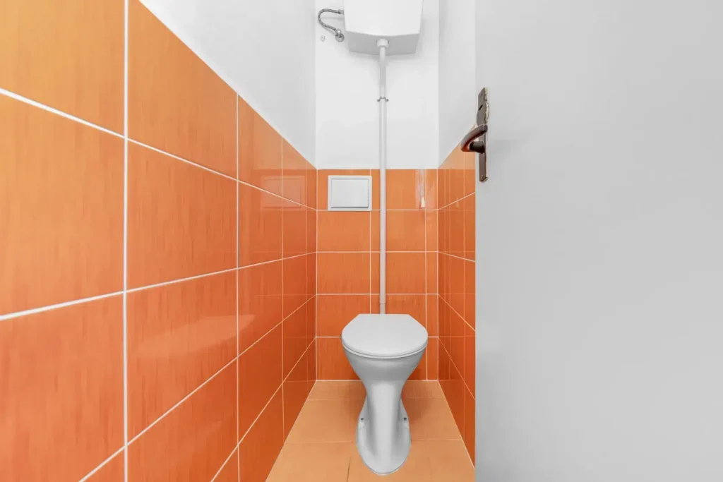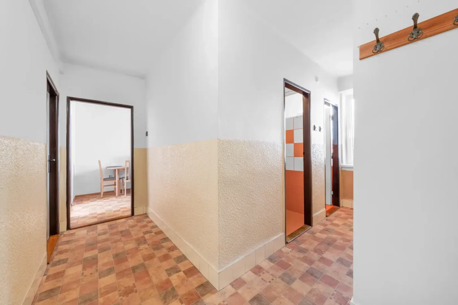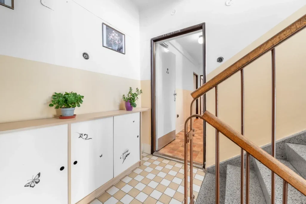 Vstupní chodba ve tvaru L nabízí úložné prostory ve formě původních vestavných skříní a samostatné vstupy do koupelny a na toaletu. Velkou výhodou je dostatek světla, které zajišťují okna v chodbě i na toaletě.
