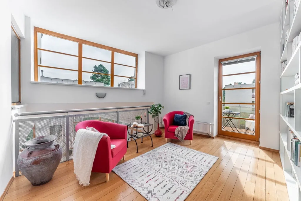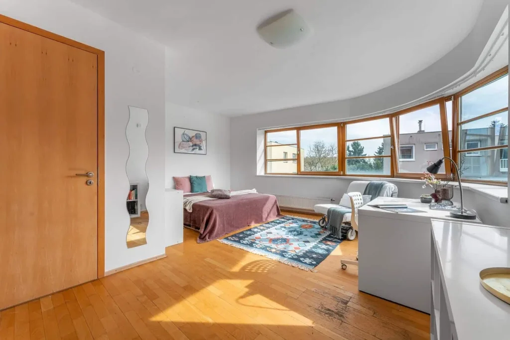 Ateliér je nejvyšším bodem domu a jeho orientace vám zaručí maximální světlost. K dispozici je zde i vstup na střechu, díky kterému se vám otevře venkovní prostor s výhledem na Prahu. Zásadním místem v domě je i ložnice, ve které dlouhé prosklení vytváří jedinečný zážitek.